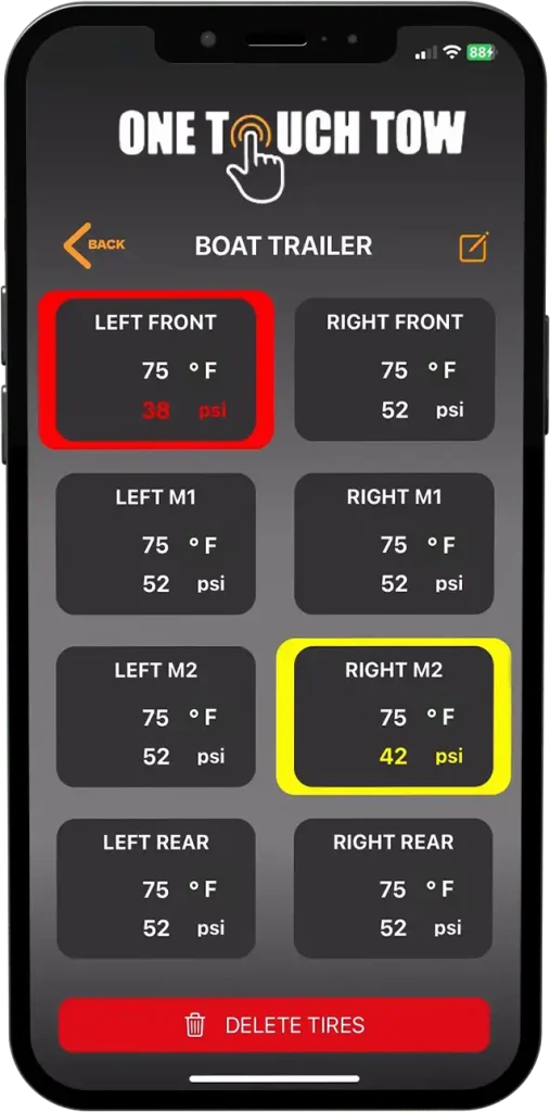 A red border indicates that a boat trailer tire’s pressure is below the user-set threshold, while the yellow border signals that the tire pressure is approaching the critical threshold.